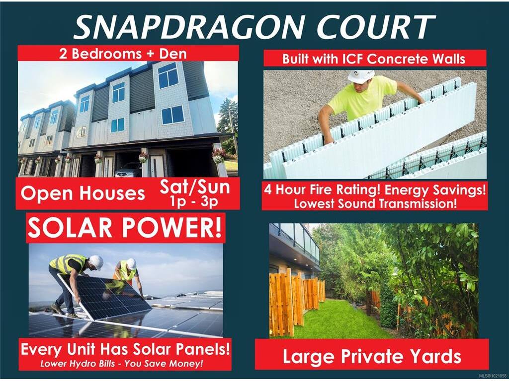"Brand New Snapdragon Court Townhome" 2 Bedroom + Den 2 Bathroom Premium Living Discover modern elegance and superior craftsmanship in these stunning new townhomes at Snapdragon Court. Perfectly situated near Happy Valley School, shopping, parks, the Galloping Goose and transit, these homes blend convenience with contemporary design. This is an RBC Green Mortgage Approved Project! (Save $$$) Features You’ll Love: • Superior Construction: • Built with ICF concrete walls for safety, strength, efficiency, and quiet comfort, • Sustainable Living: 6 solar panels on every home, 3000kw’s – Save $$$! • EV charger rough-in & door cam for future-ready solutions, • Peace of Mind: Backed by a 2-5-10 New Home Warranty, • Spacious & Bright: 9-ft & 14ft ceilings, and expansive windows, • Designer Interiors: Engineered hardwood & tile flooring, roller blinds, and custom modern kitchens, • Fully Equipped: 6 premium appliances + efficient heat pump for year-round comfort, • Outdoor Enjoyment: Beautifully landscaped grounds with generous private fenced yards, • Every home has a secure garage and a carport! Why Snapdragon Court? These homes are more than just a place to live—they’re a lifestyle upgrade. With thoughtful design, superior construction and eco-friendly features, and unbeatable location, Snapdragon Court offers the perfect balance of comfort, style, and community. No GST applicable to Qualified First Time Home Buyers.